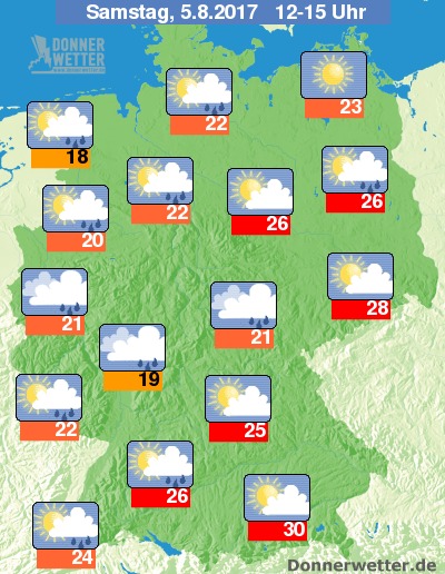 Heute Nachmittag ist es über Sachsen, Bayern und Vorpommern noch oft heiter bis sonnig und meist trocken, ansonsten ziehen dagegen größtenteils aufgelockerte bis dichte Wolken durch und es können sich wiederholt Schauer und selten auch Gewitter bilden. Die Temperatur liegt bei 18 Grad an der Nordsee und etwa 30 Grad in München.