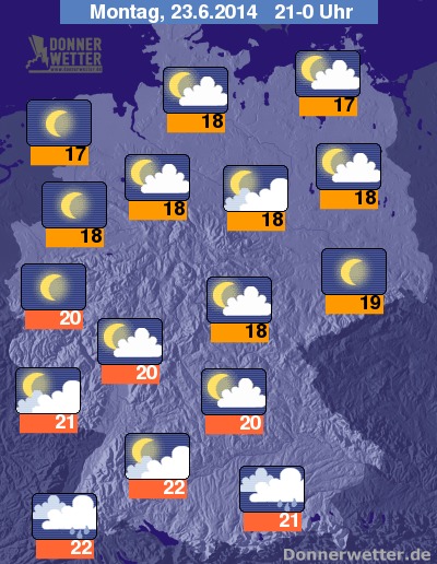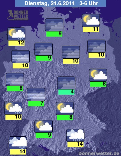 In der Nacht ist es meist aufgelockert bewölkt, zum Teil auch noch klar, dabei kann es gebietsweise neblig-trüb werden. Im Norden Schleswig-Holsteins, sowie in Richtung Alpenrand halten sich meist dichte Wolken und es fällt zeitweise Regen, sonst bleibt es trocken. Die Temperatur sinkt auf 14 Grad im Alpenvorland und 4 Grad am Elstergebirge.