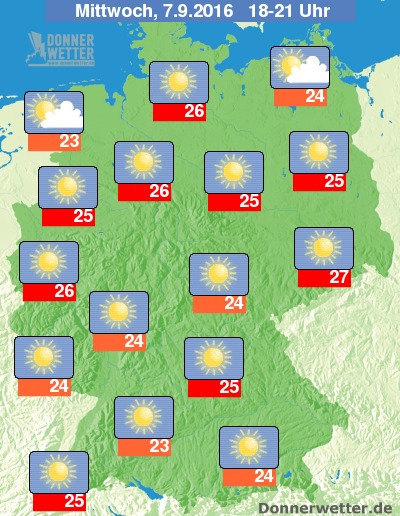 Heute Nachmittag bleibt es über der Südhälfte des Landes weitgehend sonnig und auch trocken. Weiter nach Norden hin ziehen jedoch teils lockere Wolken übers Land hinweg, jedoch bleibt es auch hier trocken. Es werden 23 Grad am Bodensee und bis etwa 27 Grad in der Lausitz erreicht.