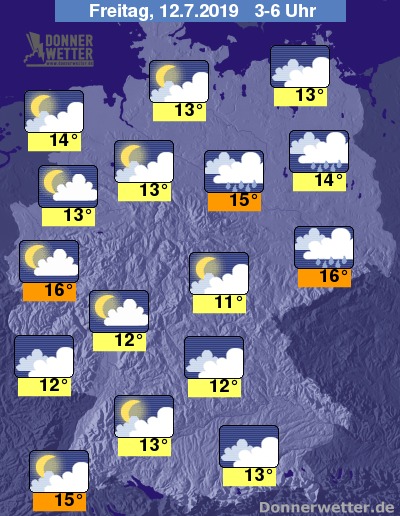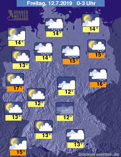 Die Temperaturen sinken im Nachtverlauf auf Werte um 16 Grad im Rheinland und um 11 Grad im Thüringer Wald.