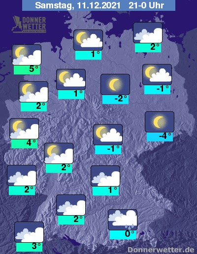 Die Temperaturen gehen bis Mitternacht auf Werte um 5 Grad im Nordwesten, 0 Grad am Alpenrand und teils -4 Grad in Ostsachsen zurück.