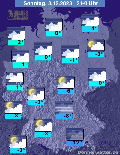 Die Temperaturen liegen in der Nacht im Westen bei Werten teils über dem Gefrierpunkt, sonst Tiefstwerte um -1 bis -9 Grad. Am Alpenrand über Schnee teils Werte unter -15 Grad.