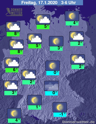 Bis zu den Frühstunden kühlt die Luft auf 1 bis 8 Grad ab, am mildesten bleibt es am Niederrhein und an der Ems. In Thüringen und Bayern kann es leichten Frost geben.