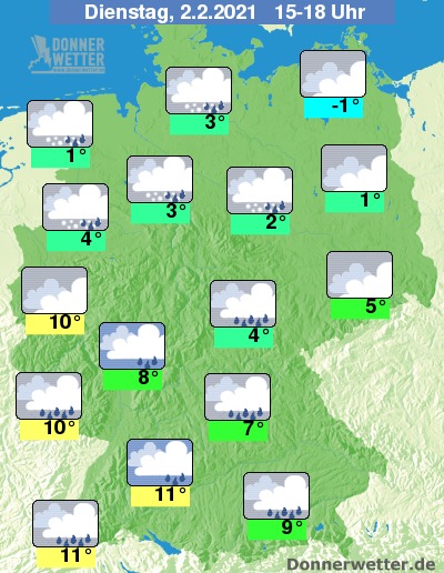 Die Temperaturen erreichen bis zum Abend Höchstwerte um -1 Grad an der Ostseeküste, um 5 Grad in Franken und teils 11 Grad am Hochrhein.