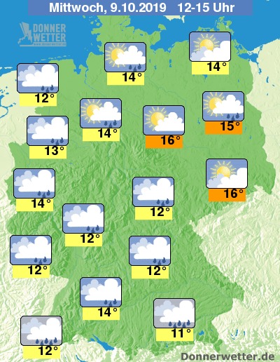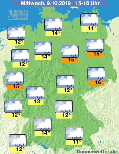 Die Temperaturen bewegen sich meistens zwischen 11 und 16 Grad. Am wärmsten wird es dabei im Lee der Mittelgebirge, da wo es auch am längsten trocken bleibt.