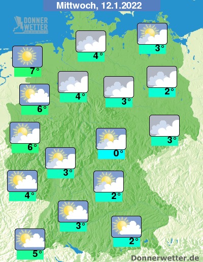 Heute ist es überwiegend stark bewölkt oder neblig-trüb, regional zeigen sich jedoch auch Auflockerungen, an der Nordsee ist es sogar oft auch heiter. Es bleibt weitgehend trocken bei Höchstwerten von 0 Grad im Grabfeld und bis 7 Grad an der Nordsee.