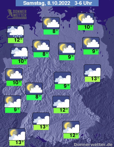 In der Nacht zum Samstag zieht im Nordwesten eine Kaltfront mit dichten Wolken und Schauern durch, sonst bleibt es meist locker bis aufgelockert, im Süden und über Sachsen eher stark bewölkt, jedoch trocken. Die Temperatur sinkt auf 13 Grad in Stuttgart und 8 Grad in Hannover.