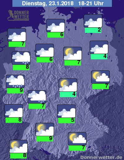 Heute Nachmittag ist es über dem Land verbreitet locker bis aufgelockert, besonders über dem Norden bleibt es aber auch überwiegend stark bewölkt, dabei bleibt es weitgehend trocken. Die Temperatur liegt bei 2 bis 9 Grad.
