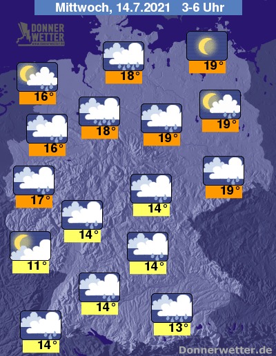 In der Nacht zum Mittwoch fällt bei überwiegend dichten Wolken verbreitet, zum Teil langanhaltender, ergiebiger und gewittriger Regen. Im Küstenumfeld ist es auch oft locker bewölkt oder sternenklar, hier bleibt es weitgehend trocken. Die Temperatur sinkt auf 19 Grad in Berlin und bis 11 Grad in Saarbrücken.