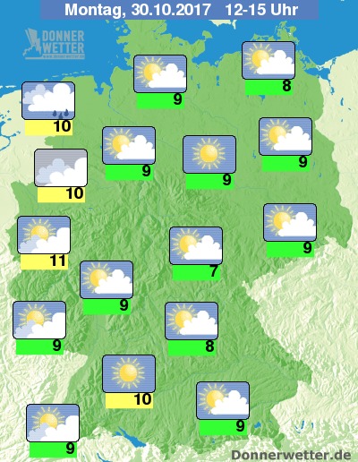 Heute Nachmittag ist es oft heiter oder sonnig, teils dichte Wolken halten sich jedoch über dem Niederrhein und dem Emsland, dabei sind in Küstennähe einzelne Schauer möglich, sonst bleibt es im Land verbreitet trocken. Die Temperatur liegt bei kühlen 7 Grad im Grabfeld und etwa 11 Grad in Köln.