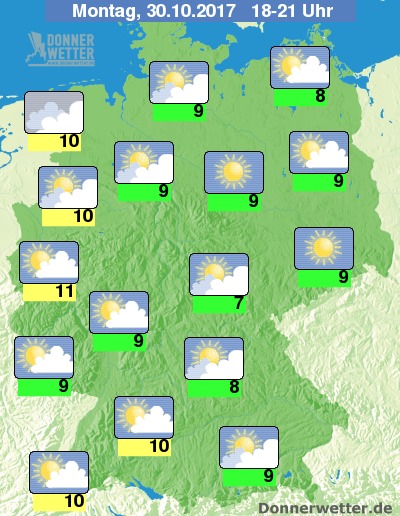 Heute Abend ist es besonders über dem Südwesten und dem Osten größtentels sonnig und sonst nur locker bewölkt. Mehr und zum Teil auch dichte Wolken ziehen über den Südosten Deutschlands, sowie über Niedersachsen und Schleswig-Holstein hinweg, dazu bleibt es weitgehend trocken. Die Temperatur liegt bei 7 bis 11 Grad.