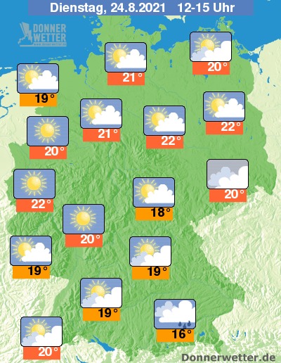 Heute Abend ziehen zunehmend einige Wolken, meist jedoch noch lockere bis noch aufgelockerte Bewölkung durch. Vor allem im Osten und Süden ist der Himmel oft auch bedeckt, dabei sind im Süden einzelne Schauer möglich, während es sonst trocken bleibt. Die Temperatur liegt bei 19 Grad in Rostock und bis 24 Grad in Köln.
