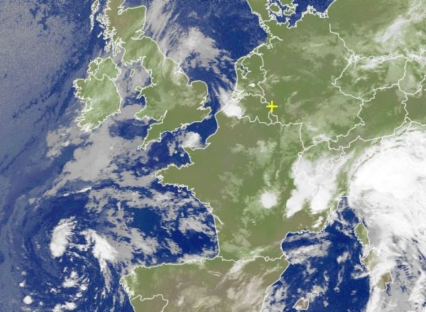 Das Satellitenbild von heute Morgen zeigt über Deutschland lockere Bewölkung. Gewitter sind über den Niederlanden und Belgien zu erkennen. Auch über den Alpen liegen Gewitterwolken.