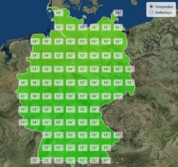 Wo es aufklart, fällt das Thermometer auf Tiefstwerte zwischen 10 und 13 Grad. In der Westhälfte liegen die Temperaturen unter dichten Wolken hingegen meist bei Werten um die 15 Grad.