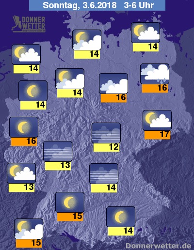 In der kommenden Nacht zeigt sich der Himmel über der Südwesthälfte der Bundesrepublik verbreitet sternenklar. Im Norden und Osten ist es hingegen meist stark bewölkt, dabei fällt in und rund um Berlin noch zeitweise Regen, sonst bleibt es aber trocken. Die Temperatur sinkt auf 17 Grad in der Lausitz und bis 12 Grad im Eichsfeld.