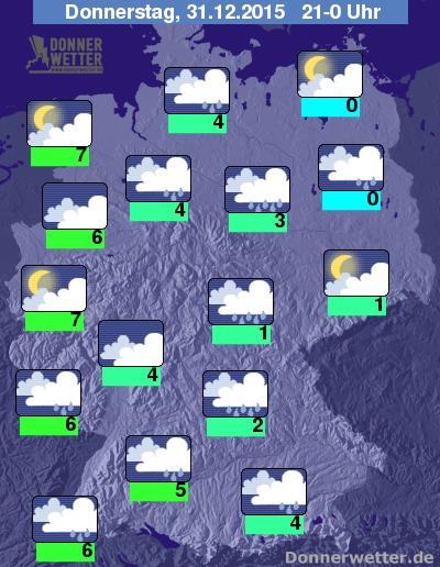 Am Silvesterabend halten sich über der Republik verbreitet dichte Wolken, dazu ist es im äußeren Osten und Nordosten anfangs noch trocken, sonst fällt vor allem östlich einer Linie vom Schwarzwald bis nach Schleswig-Holstein zeitweise Regen, zum Teil sind auch Schneeregen oder Schnee möglich, dabei besteht Glättegefahr! Weiter nach Westen hin bleibt es weitgehend trocken und vor allem im Westen lockert es auch häufig etwas auf.