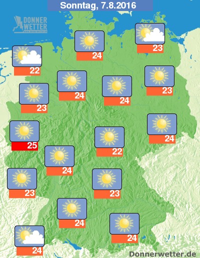 Am Sonntag ist es über dem Land verbreitet sonnig, hier und da ziehen aber auch mal lockere Wolken durch. In Küstennähe ziehen zum Teil dichte Wolken auf, dabei ist etwas Regen möglich, sonst bleibt es jedoch landesweit trocken. Die Temperatur steigt auf 22 Grad an der Unteren Weser und bis 25 Grad in Köln.