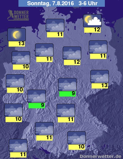 In der folgenden Nacht ist der Himmel verbreitet sternenklar, direkt an den Alpen und im Küstenumfeld von Nord- und Ostsee ziehen hier und da lockere Wolken durch, dazu bleibt es aber trocken. Stellenweise bildet sich Dunst. Die Temperatur sinkt auf 13 Grad in Emden und bis etwa 9 Grad am Westerwald.