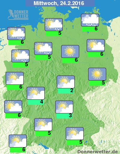Am Mittwoch ist es zunächst überwiegend heiter bis sonnig, zum Teil ziehen aber auch schon einige Wolken durch, dabei bleibt es trocken. Im Tagesverlauf ziehen über die Nordhälfte Deutschlands einzelne Schnee- oder Regenschauer, in den südlicheren Landesteilen bleibt es dagegen weitgehend trocken. Die Temperatur steigt auf 2 Grad am Thüringer Wald und bis 6 Grad im Oberrheingraben.