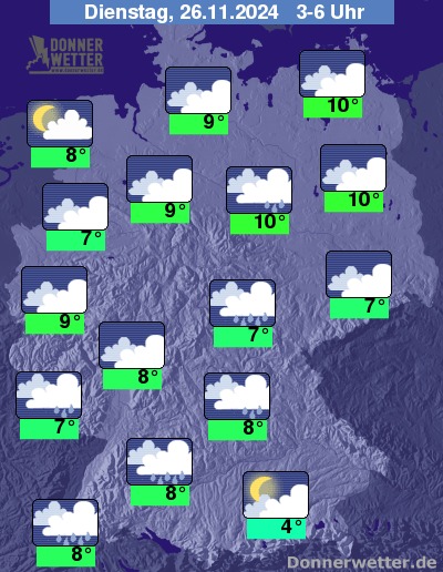 In der Nacht zum Dienstag verlagert sich der Regen in die südlichen und östlichen Landesteile. Von Nordwesten her lockern die Wolken in den Nachtstunden zunehmend auf und es bleibt weitgehend niederschlagsfrei.