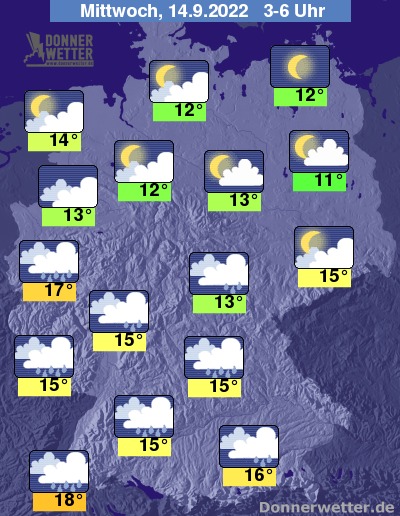 In der Nacht zum Mittwoch zieht von Südwesten her zum Teil kräftiger Regen auf, der bis zum Morgen etwa die Südhälfte Deutschlands bedeckt. Weiter nach Norden hin ist der Himmel dagegen meist locker bis aufgelockert bewölkt, dazu bleibt es trocken. Die Temperatur sinkt auf milde 18 Grad in Freiburg und etwa 11 Grad in Potsdam.