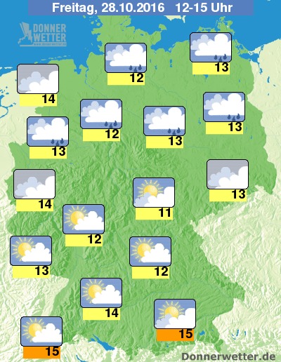 Die Temperaturen liegen um 11 Grad C in Erfurt und um 15 Grad C in Augsburg.