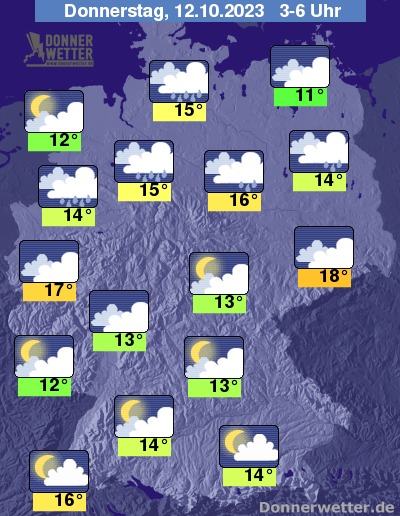 In der folgenden Nacht ist der Himmel über der Südhälfte des Landes oft aufgelockert, nur teilweise noch locker bewölkt, hier bleibt es trocken. Im Norden fällt aus dichten Wolken gebietsweise Regen, der sich bis zum Morgen auch auf die breite Landesmitte ausbreitet. Die Temperatur sinkt auf 18 Grad in Dresden und 11 Grad in Stralsund.