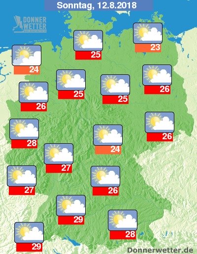 Am Sonntag ist es über der Republik wieder verbreitet heiter, hier und da wechselnd bewölkt. Bei Höchsttemperaturen zwischen 23 Grad in Stralsund und 29 Grad in Stuttgart bleibt es landesweit trocken.