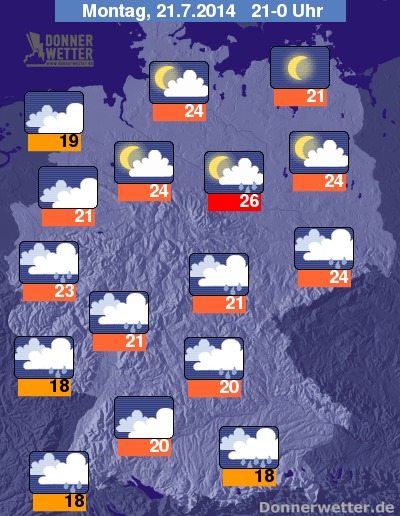 Besonders nach Süden fällt vielerorts anhaltender und teils ergiebiger Regen. Nach Norden hin ist es dagegen meist aufgelockert, im Ostseeumfeld überwiegend gering bewölkt oder klar, und meist trocken. Die Abendwerte liegen bei schwülwarmen 26 Grad in Dessau und kühleren 18 Grad am Alpenrand.