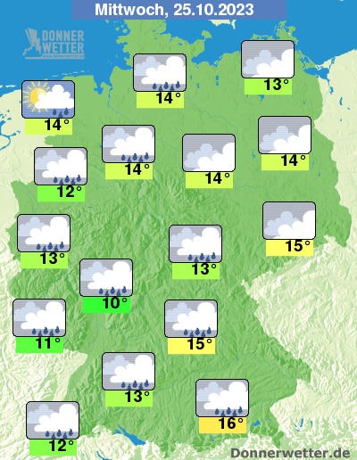 Am Mittwoch zeigen sich im Norden und Osten am Vormittag noch Auflockerungen und es bleibt zunächst trocken. Im übrigen Land ist es schon stark bis dicht bewölkt und es fällt zeitweise Regen, der im Tagesverlauf auch in den Norden und Osten weiterzieht. Die Temperatur steigt auf 10 Grad am Westerwald und bis 16 Grad im Raum München.