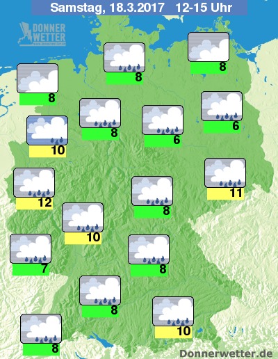 Heute Nachmittag bleibt es überwiegend dicht bewölkt, dabei klingen die Niederchläge im Norden meist ab, sonst fällt jedoch immer wieder oder auch langanhaltender Regen. Die Temperatur liegt bei 6 Grad in der Altmark und etwa 12 Grad im Rheinland.
