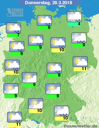 Am Donnerstag ist es teils aufgelockert, zum Teil ist es stark bewölkt. Im Norden und im Alpenvorland bilden sich dabei zeitweise Schauer, im Rest des Landes ist es hingegen zumeist trocken. Die Temperatur steigt auf 4 Grad in Vorpommern und bis 11 Grad im Breisgau.