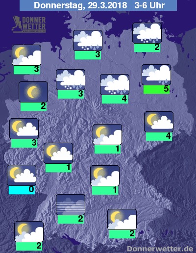 In der Nacht zum Donnerstag klingen die Niederschläge im Süden und Westen des Landes nach und nach ab und hier lockert es immer weiter auf, dagegen fällt im übrigen Bundesgebiet bis zum Morgen hin, teils langanhaltend Regen und zum Teil Schneeregen. Die Temperatur sinkt auf 5 Grad in Berlin und bis 0 Grad im Saargau.