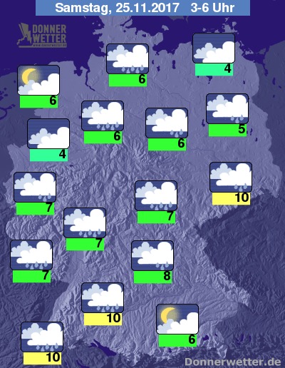 In der Nacht zum Samstag breiten sich über das ganze Land dichte Wolken aus, dazu bleibt es im Südosten und im Emsland weitgehend trocken, sonst fällt jedoch immer wieder, teils auch langanhaltender Regen. Die Temperatur sinkt auf 10 bis 4 Grad.
