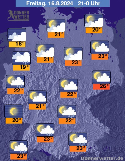 In der Nacht zum Samstag zeigt sich der Himmel meist wechselnd oder stark bewölkt, dabei muss vor allem südlich der Donau mit teils gewittrigen Schauern gerechnet werden. Auch in Teilen NRWs und Niedersachsens sind einzelne Schauer möglich.
