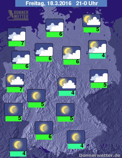 In der Nacht zum Samstag bleibt es im Süden weitgehend klar und trocken, im Norden und Osten ist es meist locker bis aufgelockert bewölkt und ebenso trocken. Oft dichte Wolken halten sich hingegen vom Westen bis ins Landesinnere, sowie auch im Nordwesten Deutschlands, hier ist gelegentlich auch ein wenig Regen oder Sprühregen möglich, meist ist es jedoch trocken. Die Temperatur sinkt auf 5 Grad in Aachen und etwa 0 Grad im nördlichen Brandenburg.