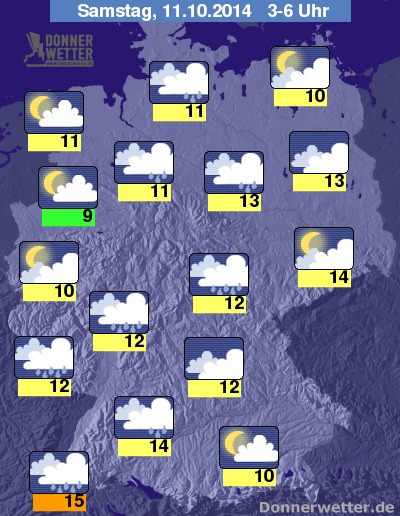 In der Nacht zum Samstag bleiben die Wolken weiterhin vielfach dicht, nach Nordwesten hin, vor allem aber im Südosten ist es aber auch häufig aufgelockert bewölkt, hierbei bildet sich jedoch örtlich Nebel oder Dunst. Regen fällt in einem breiten Streifen vom Südwesten Deutschlands, über die Mitte des Landes bis hoch zur Ostsee, sonst bleibt es weitgehend trocken. Die Temperatur sinkt auf 15 Grad im Breisgau und bis 9 Grad im Münsterland.