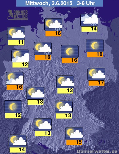 Örtliche Schauer beschränken sich auf den Nordwesten Deutschlands, hier werden mit Tiefsttemperturen um 13 Grad C auch die niedrigsten Werte im Bundesgebiet erreicht. Im Nachtverlauf verlagert sich der Regen dann in Richtung Nordosten