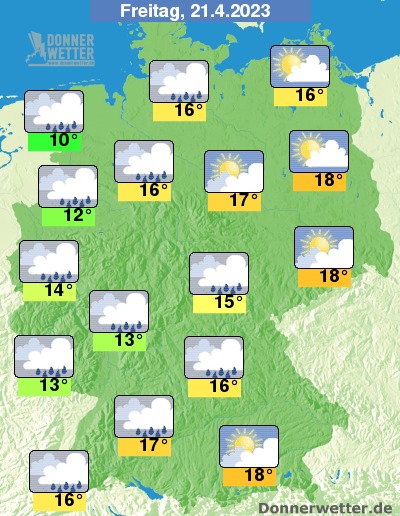 Am Freitag zeigen sich in den östlichen Landesteilen noch oft heitere Abschnitte, hier bleibt es bis zum Abend voraussichtlich noch trocken. Weiter nach Westen hin ziehen dagegen zunehmend mehr und auch dichte Wolken auf, die im weiteren Verlauf Schauer und örtlich auch Gewitter bringen können. Die Temperatur steigt auf 10 Grad an der Nordsee und bis 18 Grad in der Lausitz.