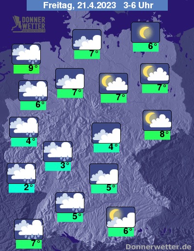 In der bevorstehenden Nacht ist der Himmel über dem Osten und Nordosten locker bewölkt oder sternenklar, dazu bleibt es trocken. Über den westlichen Landesteilen halten sich hingegen kompakte Wolken und es fällt zeitweise Regen. Im übrigen Land ist es überwiegend stark, hier und da etwas aufgelockert bewölkt, dazu bleibt es weitgehend trocken. Die Temperatur sinkt auf 9 Grad in Wilhelmshaven und 2 Grad in Saarbrücken.