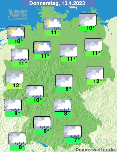 Am Donnerstag bleibt es größtenteils dicht bewölkt. Stellenweise, vor allem im Norden ist es hier und da auch aufgelockert bewölkt. Es bilden sich gebietsweise Schauer bei Höchstwerten von 7 Grad in München und bis 13 Grad in Köln.
