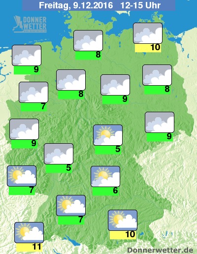 Nach dem verregneten Start in den Tag im Norden legen die Niederschläge am Nachmittag eine Pause ein. Dennoch verdecken nach wie vor dichte Wolken die Sonne, diese zeigt sich lediglich im Süden. Bis zum Abend kommen im Schwarzwald und am Alpenrand zahlreiche Sonnenstunden zusammen.