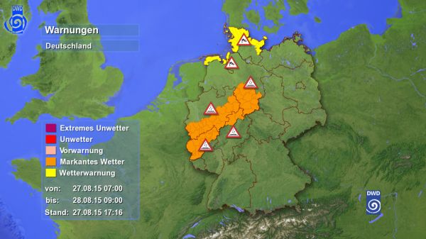 Am Donnerstag Abend sind Schauer und stärkere Regenfälle über den Norden Deutschlands angesagt. Besonders in den Bundesländern Niedersachsen und NRW. Im Süden Deutschlands bis in die Sächsische Schweiz hält sich das Wetter hingegen trocken. Es bestehen Warnungen für die Landesmitte.