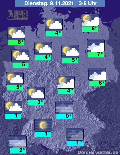 In der Nacht zum Dienstag ist der Himmel über Süddeutschland meist sternenklar, weiter nach Norden hin ist es größtenteils locker bis aufgelockert bewölkt. Besonders vom Osten bis in den Nordosten des Landes halten sich meist dichte Wolken. Es bleibt überall trocken bei Tiefstwerten von 8 Grad in Wilhelmshaven und bis -1 Grad im Raum München.