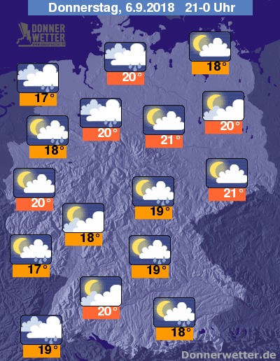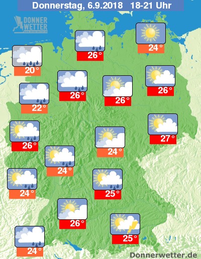 Am Abend muss insbesondere in der Westhälfte und im Süden mit örtlichen Regengüssen und Gewittern gerechnet werden. Dabei drohen Platzregen und Hagel. Im Osten bleibt es noch freundlich und spätsommerlich. Dort wo es trocken bleibt liegen die Temperaturen zunächst noch bei 24 bis 27 Grad. Bei Schauern kühlt die Luft jedoch spürbar ab.