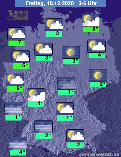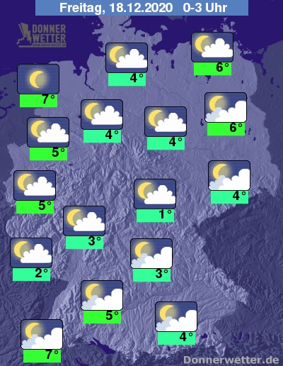Während der zweiten Nachthälfte bleibt es vorwiegend wechselnd bewölkt, gebietsweise leuchten die Sterne auch mal für längere Zeit. Im weiteren Verlauf breiten sich teilweise Nebelfelder aus.