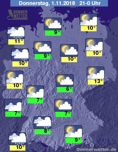Während der zweiten Nachthälfte kann es ganz im Nordwesten gelegentlich noch etwas regnen, sonst bleibt es trocken und der Himmel klart teilweise auf. Stellenweise können sich einige Nebelfelder bilden. Bis zu den Frühstunden kühlt die Luft auf 5 bis 10 Grad ab, was jedoch für die Jahreszeit ziemlich mild ist. Am mildesten bleibt es unter den dichten Wolken im Emsland.