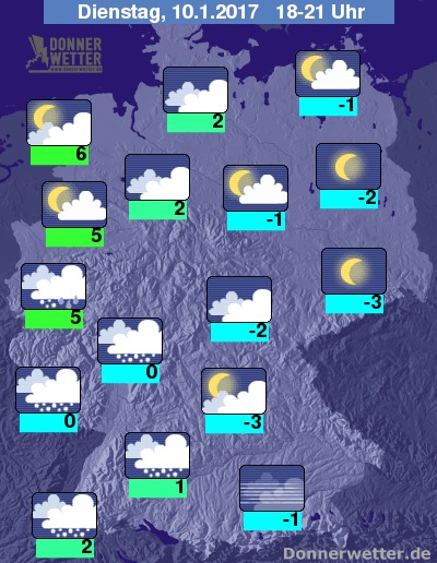 In der Nacht zum Mittwoch halten sich nach Südwesten hin dichte Wolken aus denen Schnee, Schneeregen oder auch teils Regen fällt, dabei besteht Glättegefahr! Weiter nach Nordosten hin ist der Himmel meist nur locker bewölkt, vor allem im Osten auch sternenklar, dazu bleibt es trocken. Die Temperatur sinkt auf 4 Grad in Emden und bis auf -11 Grad in Mittelfranken.