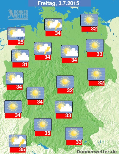 Am Freitag ist es im Land zum Großteil wiederum sonnig, hier und da können ein paar lockere Wolken durchziehen. Ein mäßiges Schauer- und Gewitterrisiko besteht jedoch im Norden Deutschlands, hier sind regional schwere Gewitter möglich, auch rund um den Schwarzwald und am Alpenrand können vereinzelte Schauer und Gewitter auftreten, sonst bleibt es aber trocken. Die Temperatur steigt auf verhältnismäßig frische 25 Grad an der Nordsee und auf tropische 35 Grad im Breisgau.
