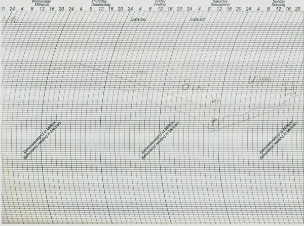 Der Schrieb zeigt den Luftdruckverlauf an unserer Wetterstation in Bonn.